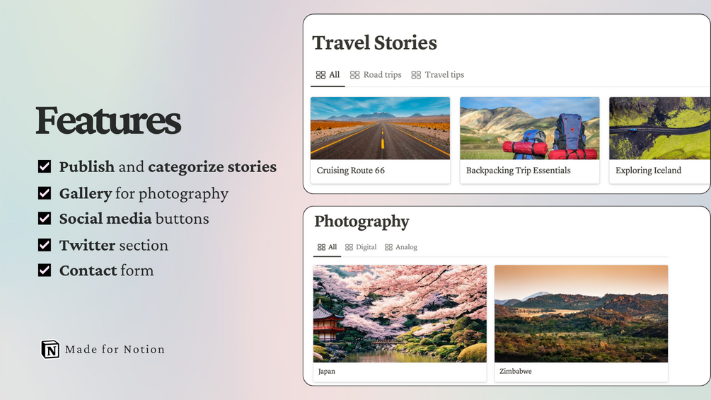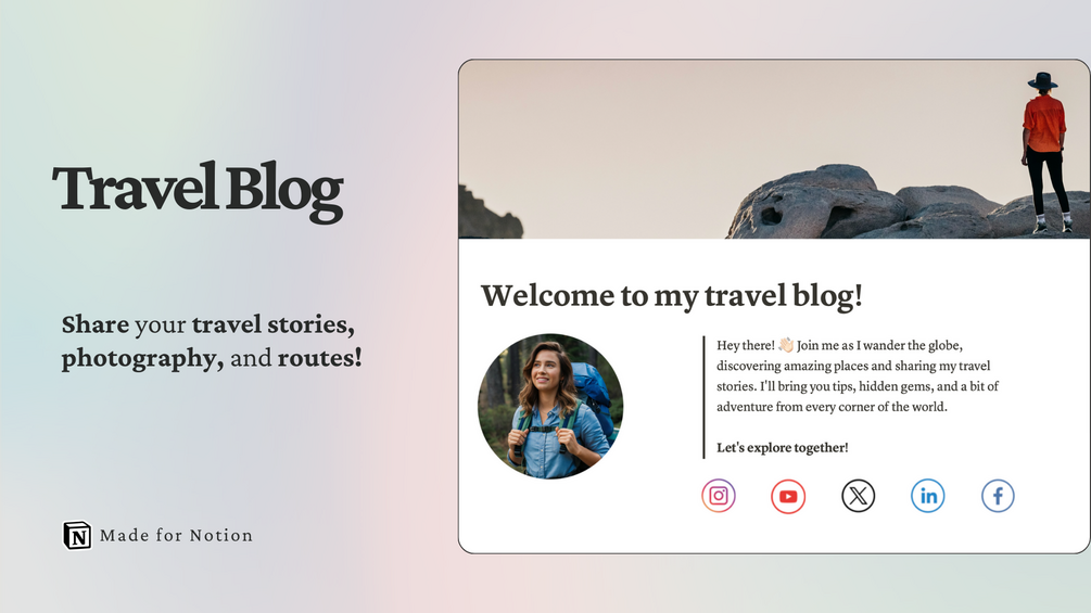 Share your travel experiences into captivating stories with this Travel Blog Notion template. Publish stories, itineraries, and travel tips effortlessly, enhanced by interactive maps and photo galleries. Seamlessly integrate social media buttons to reach a global audience. Start documenting your adventures with ease and share your journey with the world!